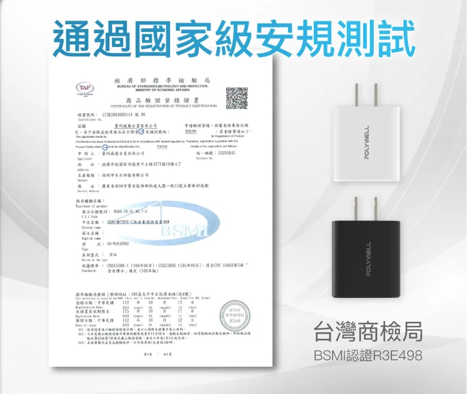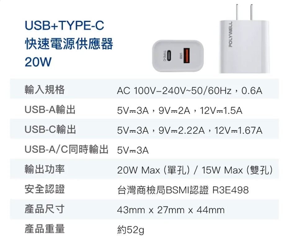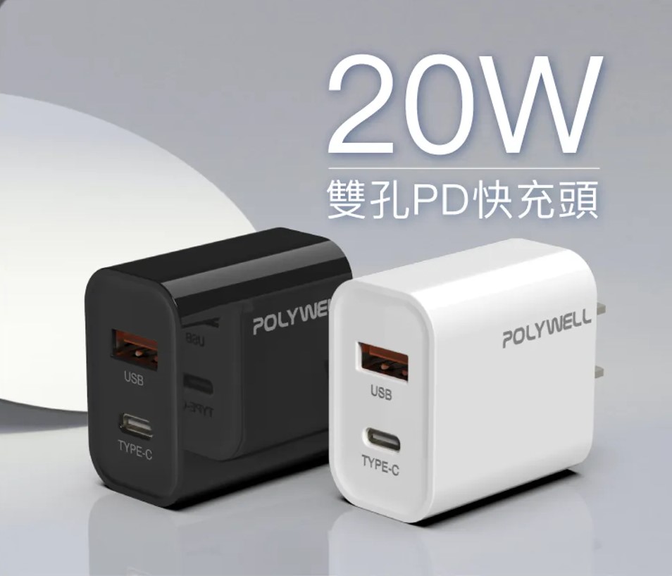 【POLYWELL】20W PD快充頭 2孔充電器 BSMI認證 白色款
