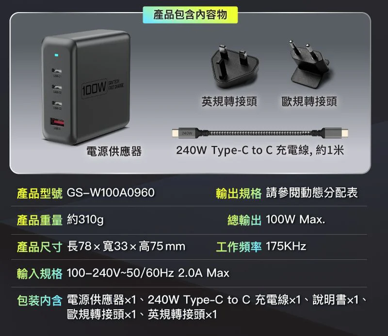 ◎ 包裝內含:電源供應器、240W Type-C to C 大功率充電線 約1米、插腳轉接頭 歐規/英規、說明書,以上各1入