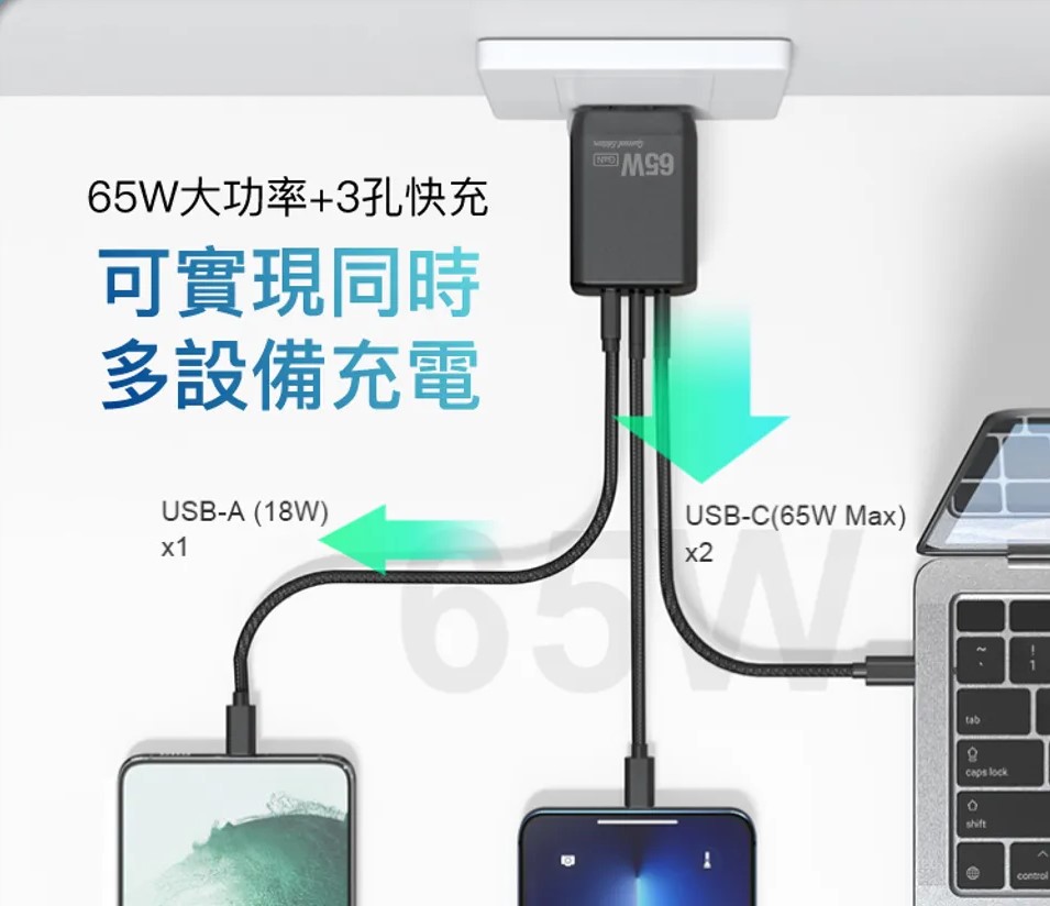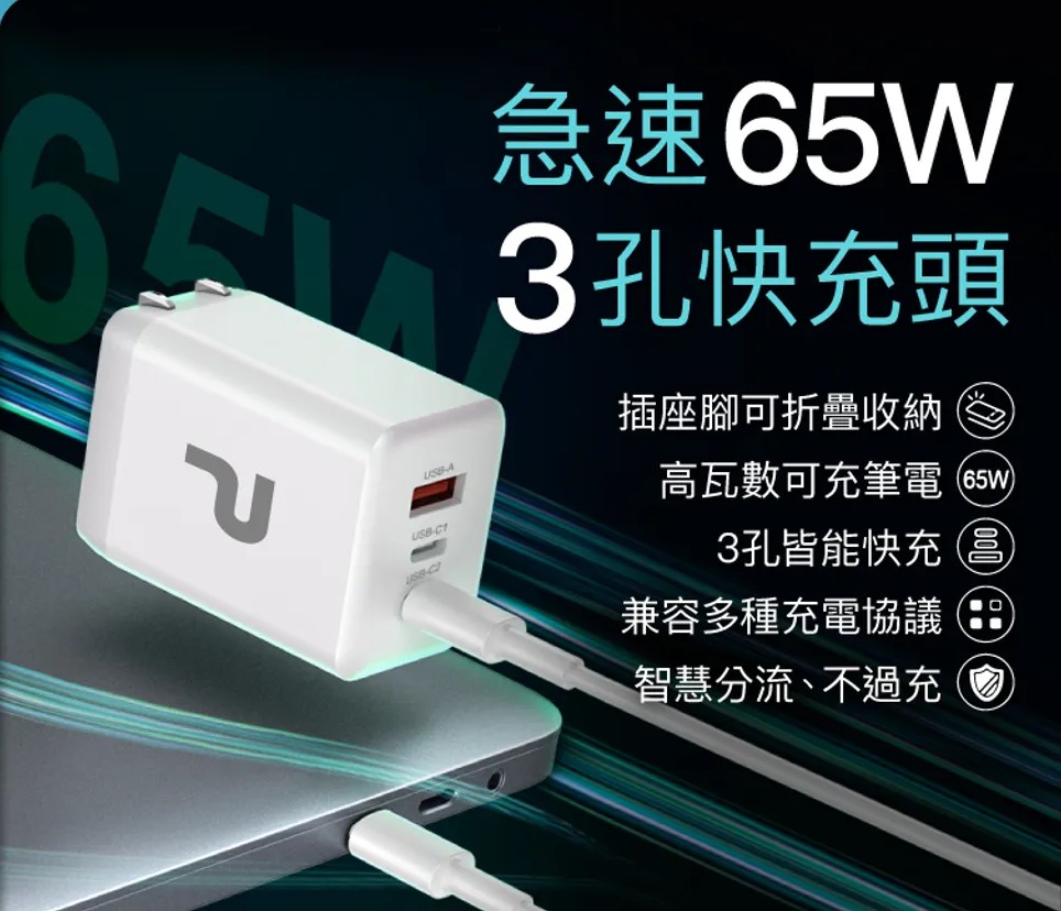 - 市面上體積最小的65W 3孔充電器, 重量也僅有123克