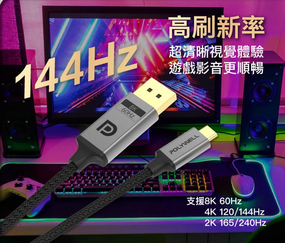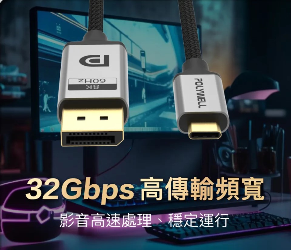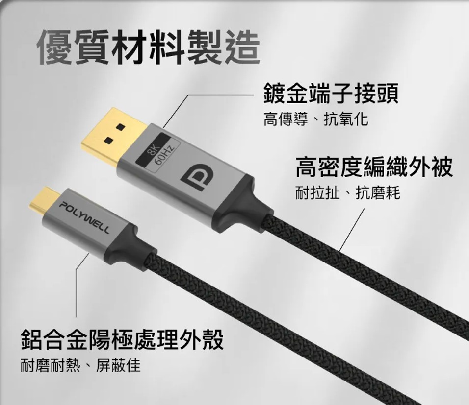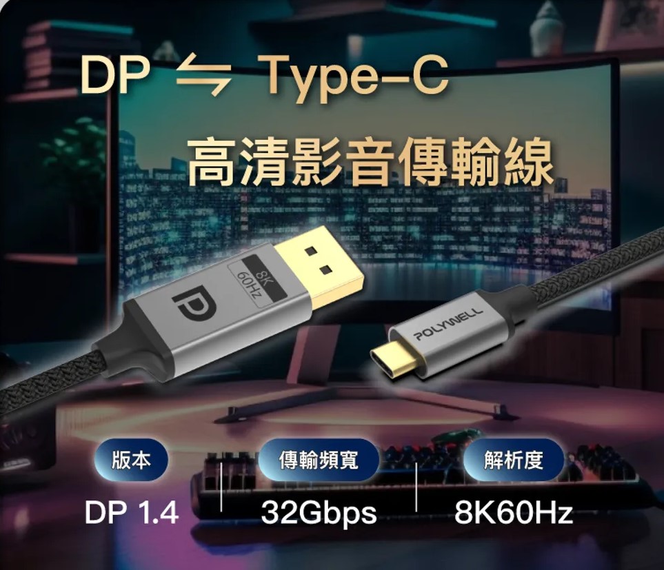 【POLYWELL】Type-C To DP 1.4 8K 雙向傳輸 鋁合金編織線 2米
