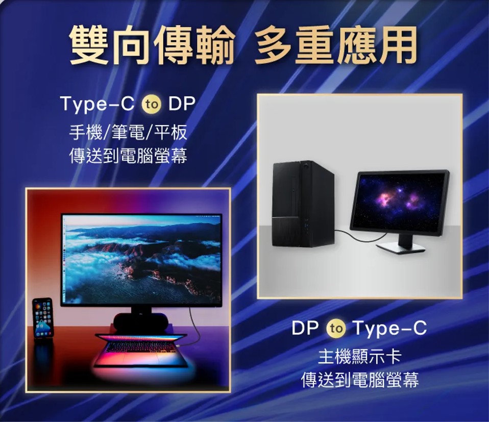 可雙向轉換USB Type-C To DP訊號, 可迅速連接筆電到螢幕或顯卡到螢幕 (Type-C埠需支援DP Alt Mode)