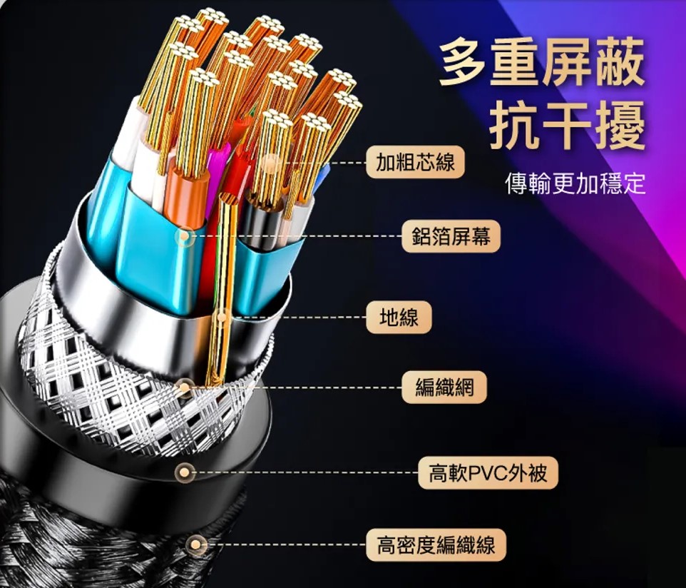 高規DP專用線材, 5組分別用鋁箔屏蔽外, 再加高密度編織層, 降低EMI