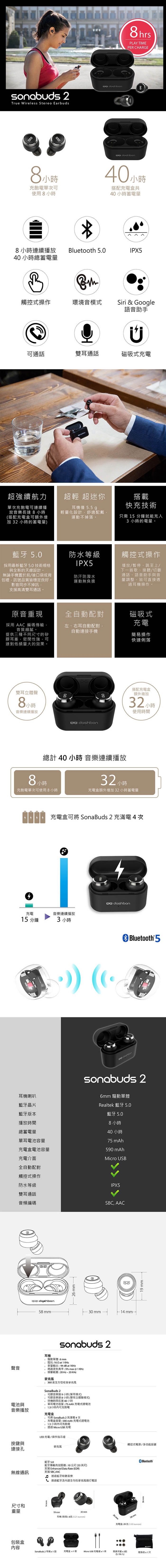 - SonaBuds 2 可聽音樂達9小時(單耳模式) 可聽音樂達8小時(雙耳立體聲模式)