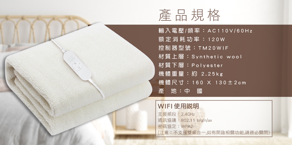 【HERAN禾聯】WIFI智能雙溫控羊毛絨雙人電熱毯 HEB-12NB05W
