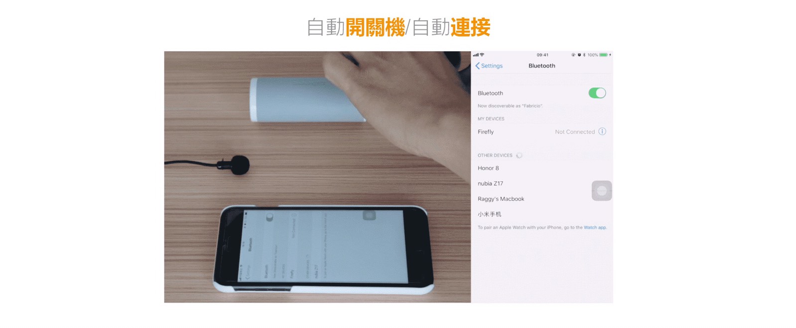 1.兩耳從充電盒取出即可自行配對,配對完成單耳閃紅藍燈時即可開手機藍牙搜尋firefly