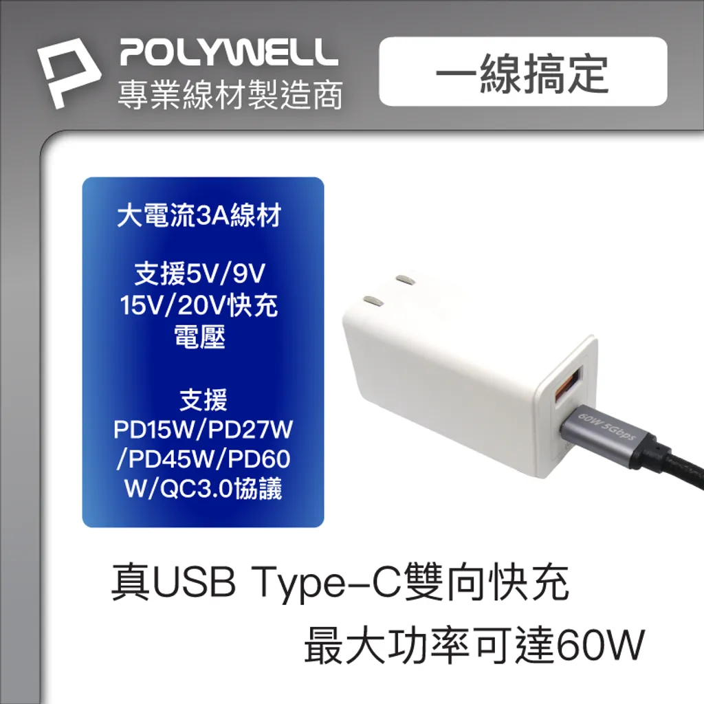 【POLYWELL】USB3.1 Type-C 3A 60W傳輸充電線 5Gbp 1M / 2M