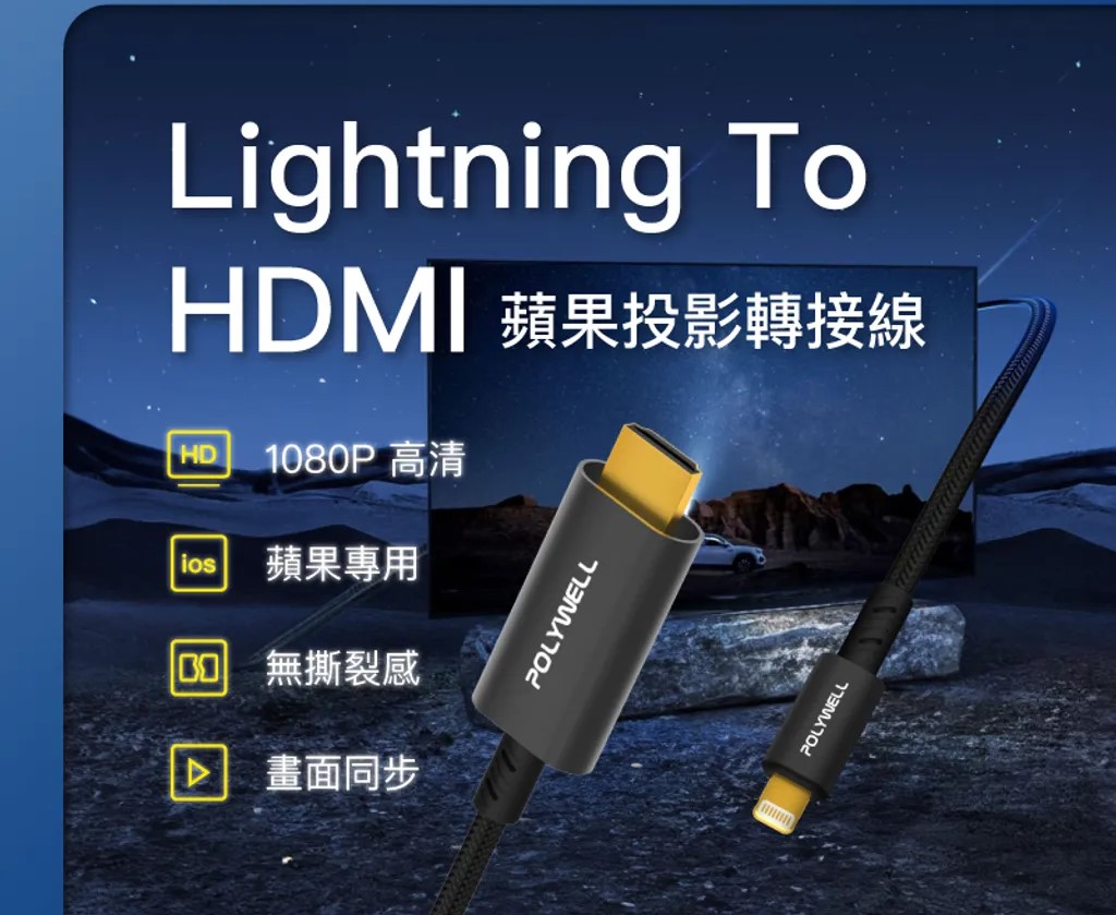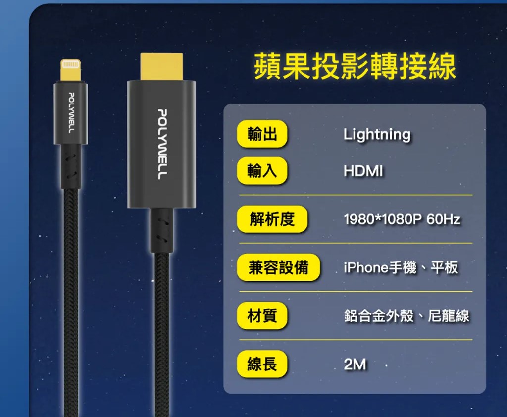 【POLYWELL】Lightning轉HDMI 1080p 2米 影音轉接線 iPhone14以前適用