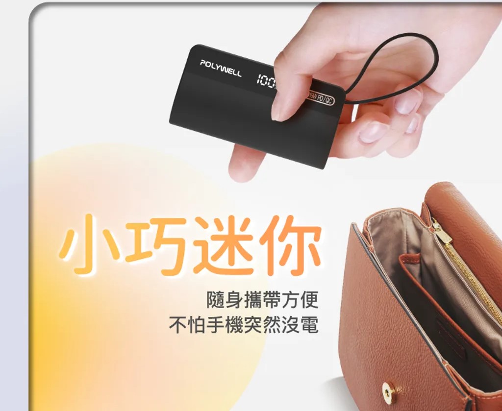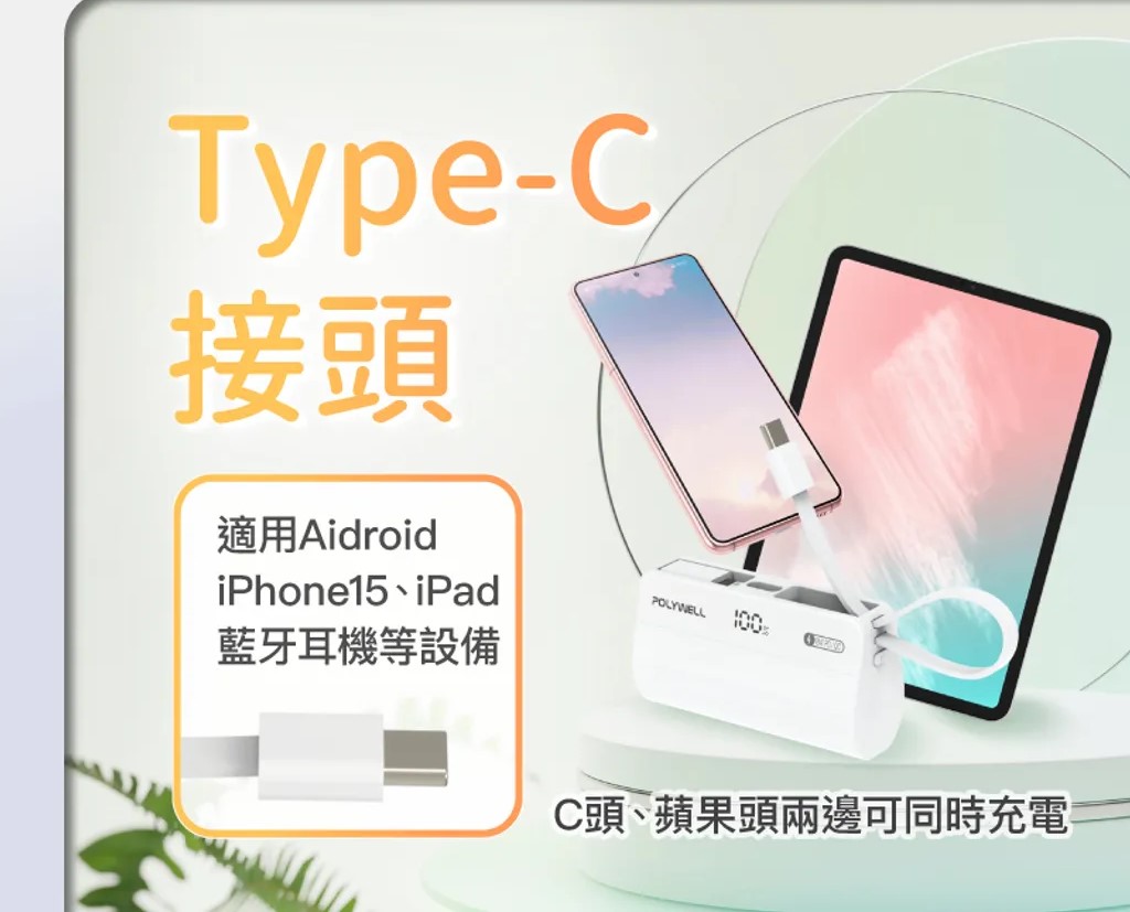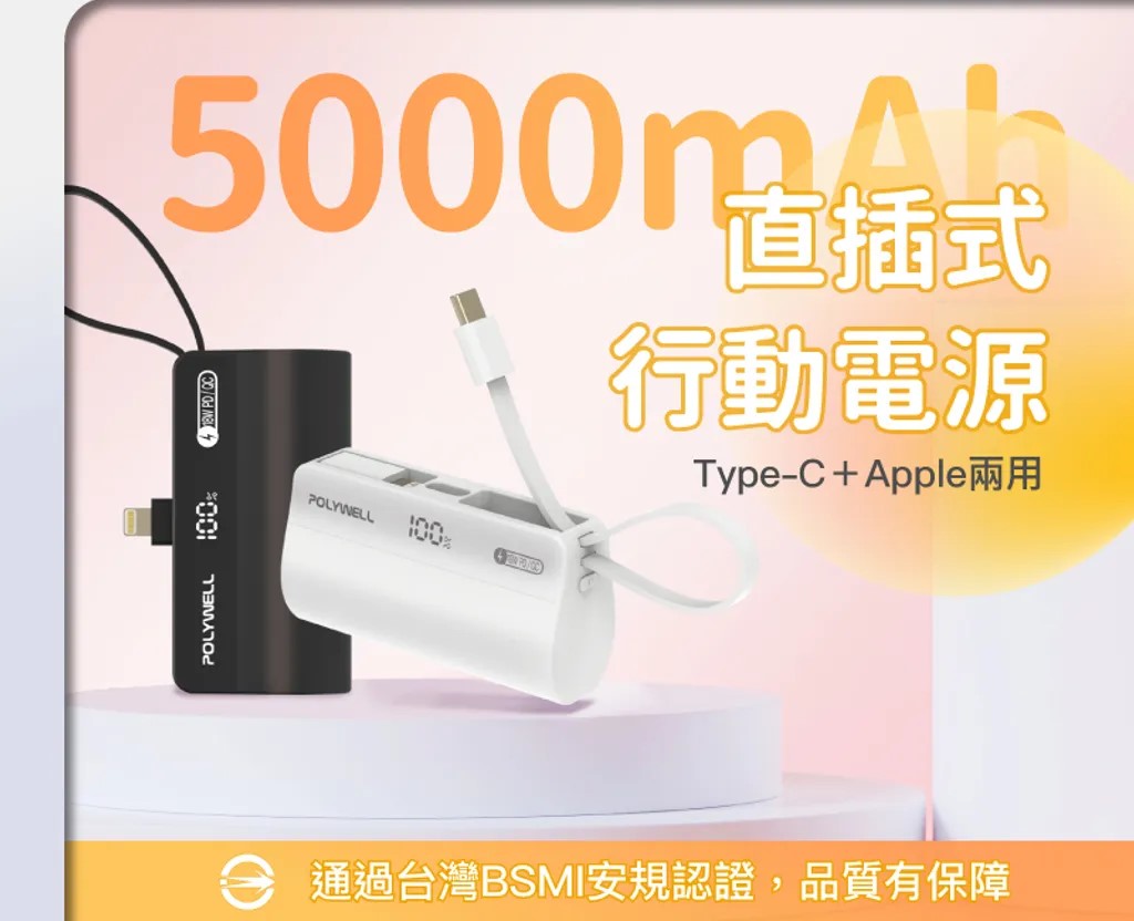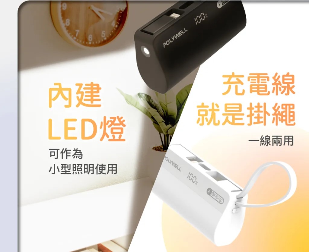 【POLYWELL】 18W 直插快充行動電源 5000mAh 蘋果線 Type-C 自帶線 i15適用