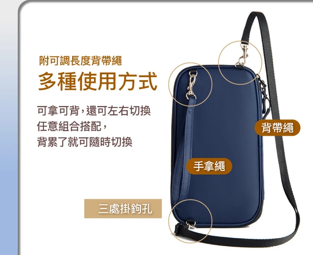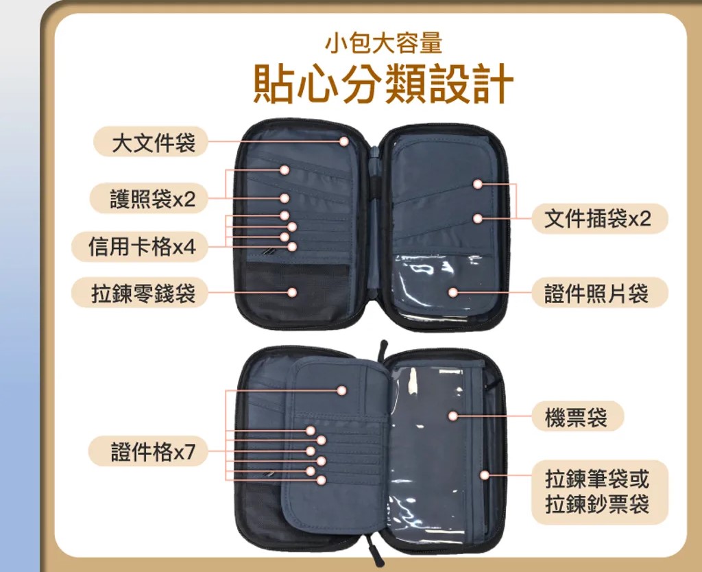 大容量 可收納3~4本護照, 信用卡/證件卡/會員卡10張以上, 零錢/鈔票/登機卡都能放置, 出外旅遊一包搞定