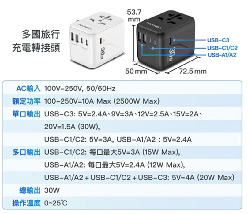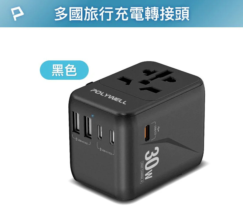 【POLYWELL】30W 多合一萬國轉接頭 出國旅行轉接插頭 三Type-C+雙USB-A BSMI免驗