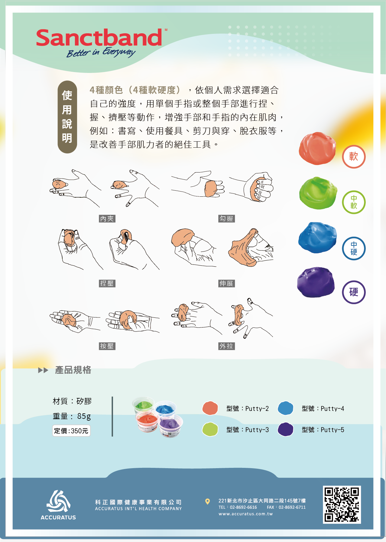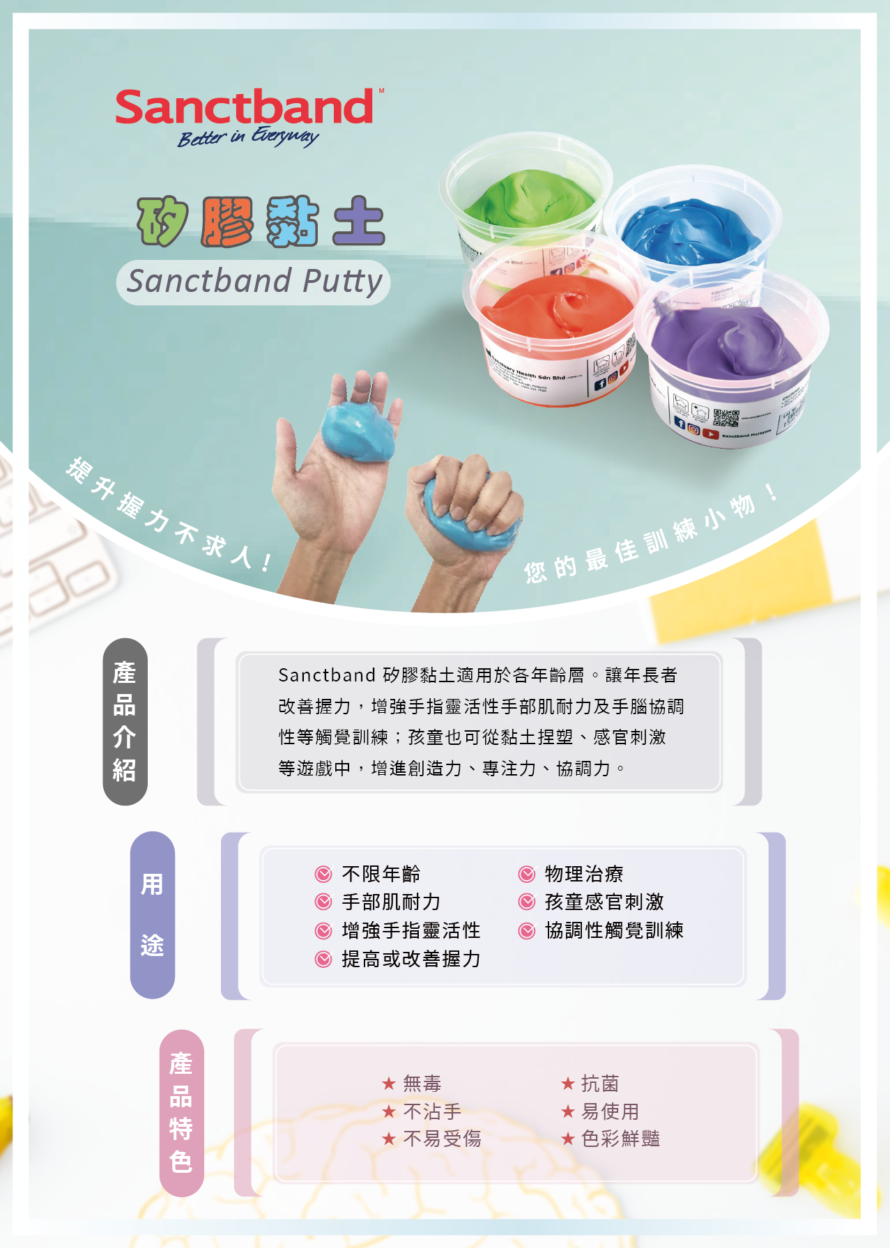 Sanctband Putty矽膠黏土適用於各年齡層。 讓年長者改善握力,增強手指靈活性手部肌耐力及手腦協調性等觸覺訓練; 孩童也可從黏土捏塑、感官刺激等遊戲中,增進創造力、注力、協調力。