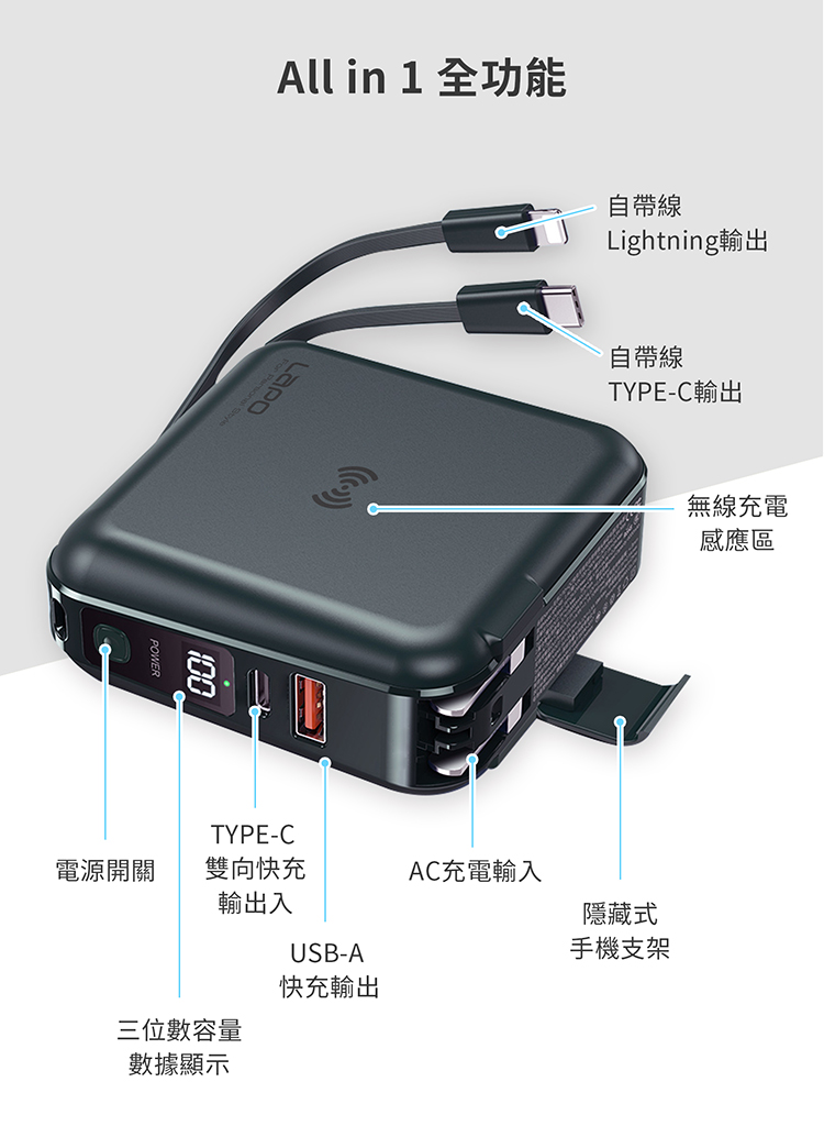 ■ 隱藏式手機支架,LED電量顯示,90度旋轉收納插頭