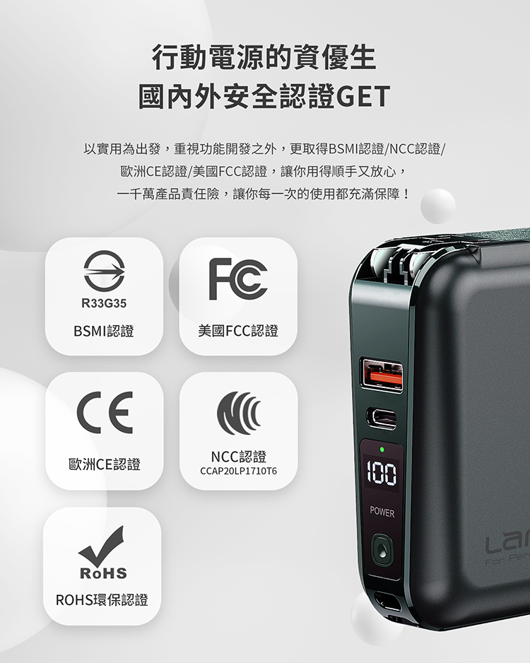 兩種自帶線+雙口輸出,最高支援五台設備同時充電,通過各大國內外安全認證(BSMI認證/NCC認證/歐洲FCC認證),全方位安全機制保護(過充保護、短路保護、電芯保護等多種保護) [商品簡介]