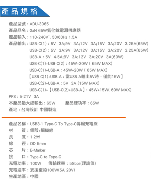 IOIO 65W氮化鎵充電器 3孔快充頭 ADU3065 全球用急速充電組