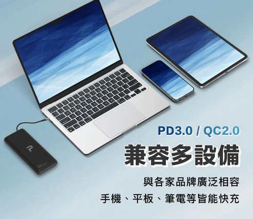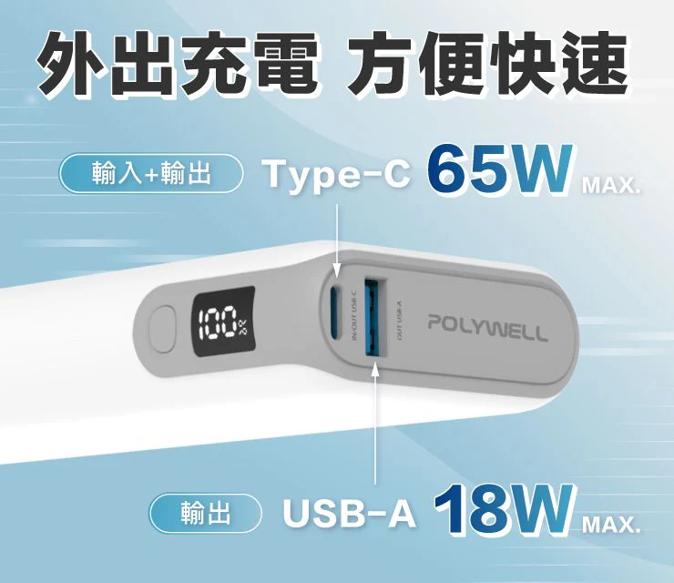 【65W大功率雙向快充】Type-C單孔輸入及輸出功率皆可達65W,為您的設備極速充電,手機、平板、連筆電都能充!