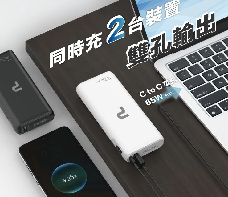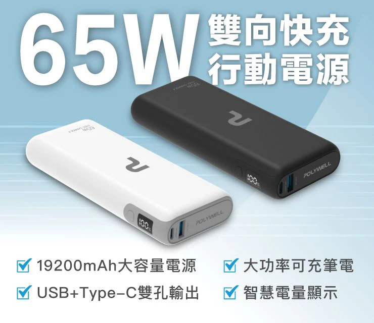 【Polywell】65W大功率行動電源 快充 19200mAh Type-C 可充筆電