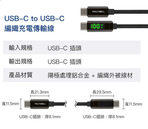 【Polywell】USB Type-C To C 100W 數位顯示PD快充線 2米
