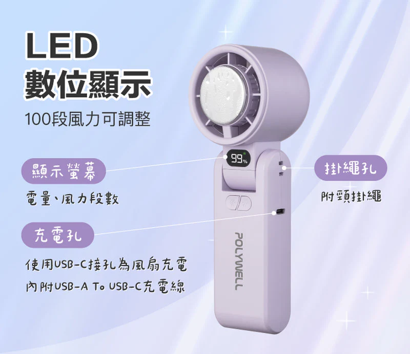 【Polywell】折疊式數顯冰敷風扇 100段風速 冷敷降溫 Type-C充電 附掛繩