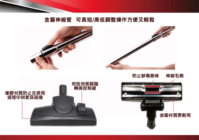 ◆金屬伸縮管,更加堅固耐用 ◆附複合式扁平刷、旗艦式金屬地刷、細絨式家具刷